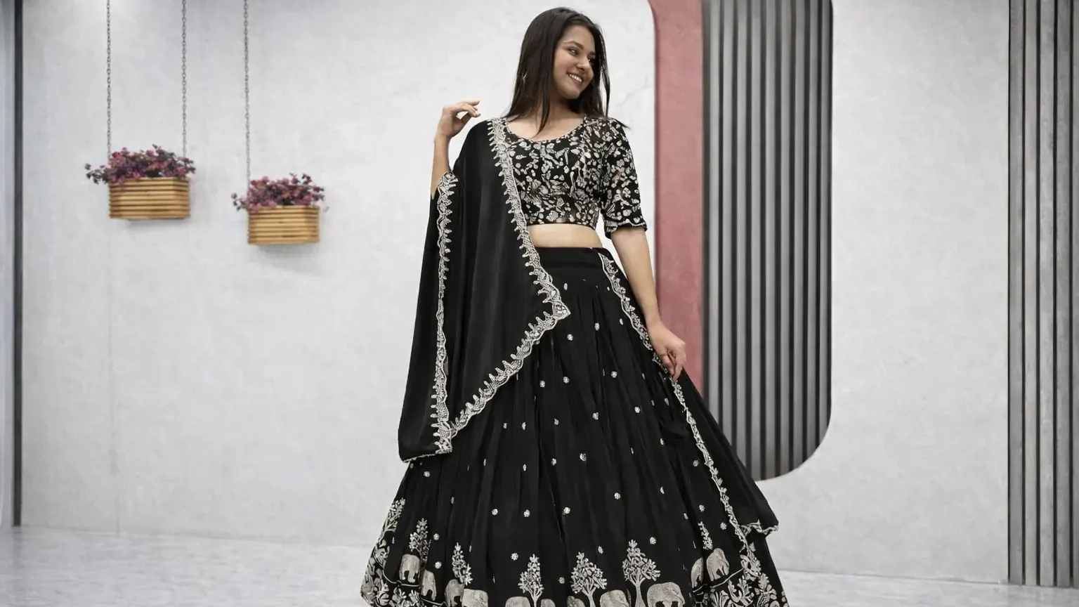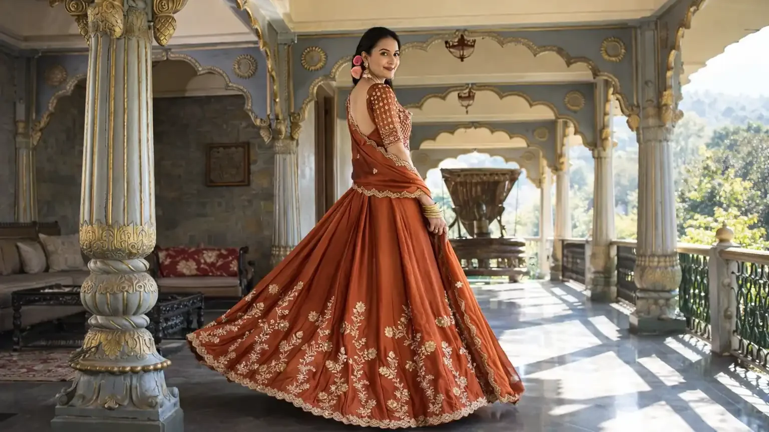 Silk lehengas often feature traditional patterns like paisleys, temple borders, and floral designs. They are elegant, graceful, and long-lasting.